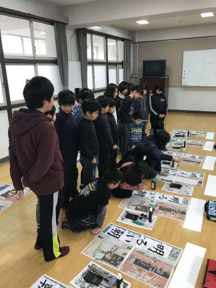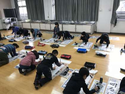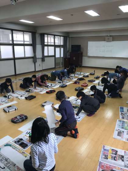 いつもの半紙とは違い、書き初め用の大きな半紙に書くので、いつもとは違った姿勢で筆を持ち、書きました。