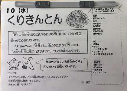 今日の給食献立に出た、栗金団の「金団」は金の団子もしくは金の布団という意味で、転じて金塊や金の小判などに例えられ、「商売繁盛・金運・財運をもたらすように」という願いが込められています。