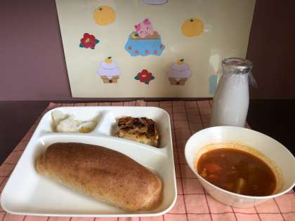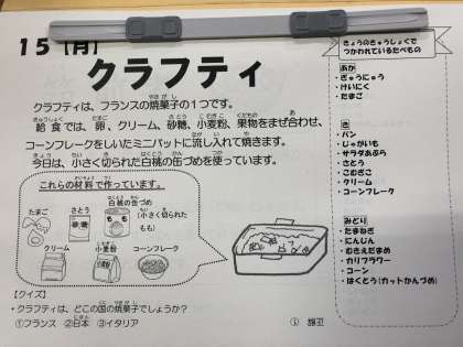 今回は、白桃カット缶づめを使っています。他にも、ミックスフルーツ缶づめやりんごカット缶づめを使ったクラフティも、給食に登場しています。