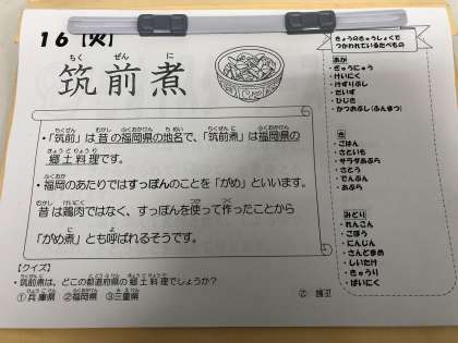 今日の給食の「筑前煮」は、福岡県の郷土料理です。呼び方は、「筑前炊き」や「がめ煮」とも言われています。昔は、鶏肉ではなくスッポンを使っていたといわれています。