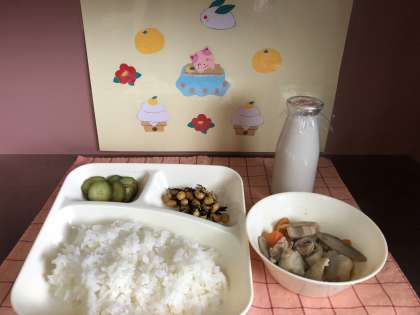 今回の給食では鶏肉、さといも、こんにゃく、れんこん、ごぼう、にんじん、三度豆、しいたけなどを使用して作りました。