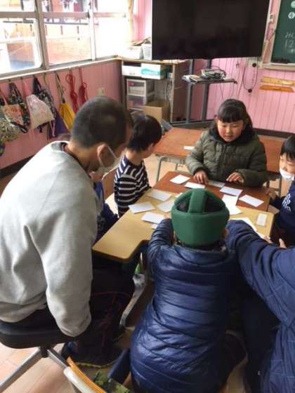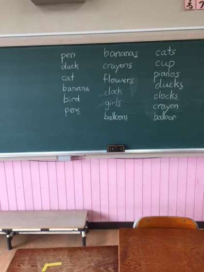 カルタを使って学習を進めていきましたが、ものがたくさんあると、“s”を付けるんだということを遊びを通して1年生なりに理解できてきたようでした。少しずつですが、積み重ねられてきていることを実感した1時間でした。