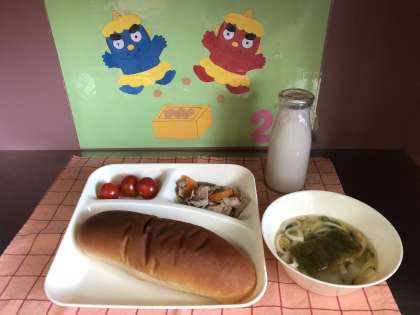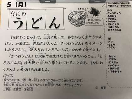 「きつねうどん」をイメージして、三角に切って甘辛く煮たうすあげと、かまぼこ、青ねぎを入れ、とろろこんぶを添えたうどんを、給食では「なにわうどん」と名付けました。子どもたちは、とてもおいしそうに食べていました。