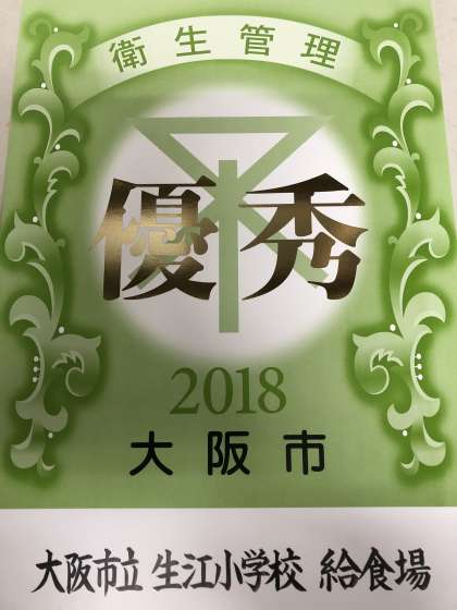 また、本校の給食室が「衛生管理に優れた施設」であるとして、大阪市から食品衛生管理優秀標をいただきました。給食調理員さんの日頃の衛生管理を、昨年に引き続き今年も認めていただきました。これからも、おいしく安全な給食を提供していきます!