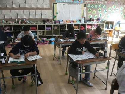 自分が書き終わっても、まわりの友だちが書き終わるまで静かに待つ。