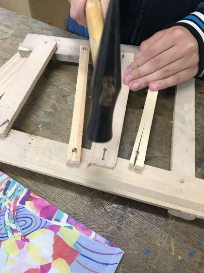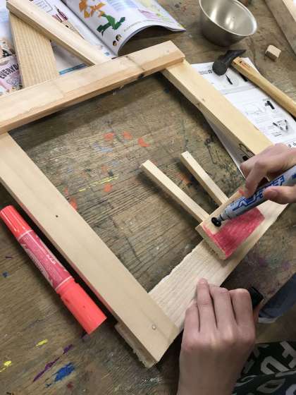 のこぎりで切ったり、切った木材同士を金づちとくぎを使ってつないだり、そして、色をぬったりしました。
