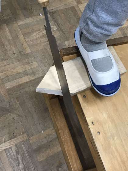 先週、初めてのこぎりをつかったときには、うまく木材を切ることができていなかった子も、今日は、のこぎりをうまく使って切ることができ、金づちのくぎうちも上手にできる子が増えました。