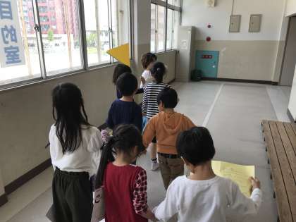 今の2年生も、一年前は、一つ上のお兄さんお姉さんに連れられて、学校を探検しました。そのときは、右も左もわからない状態でしたが、今では、学校のことを説明できるほど、立派に成長しました♪