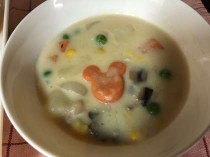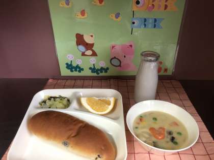 今日の給食献立の「コーンクリームシチュー」に給食調理員さんが「ラッキーにんじん」を作ってくださいました。形は、「ミッキー型、花型、ハート型」などがありました。子どもたちは、あるかな?とワクワクしていました。