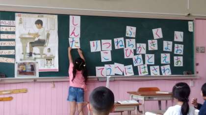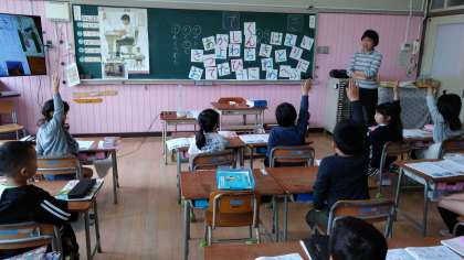 5時間目は、今までに習ったひらがなを使った「言葉づくり」をしました。「あめ」「へび」など全員しっかりと言葉を考えて発表することができましたよ♪♪