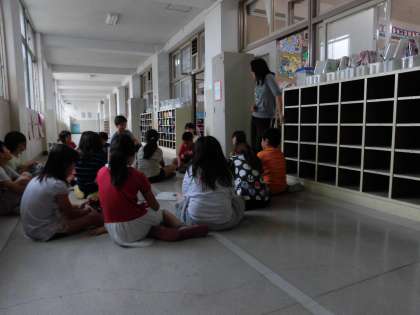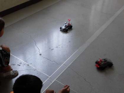 前はソーラーカーを作り外で車を走らせましたが、今日は乾電池を使って廊下で走らせました。