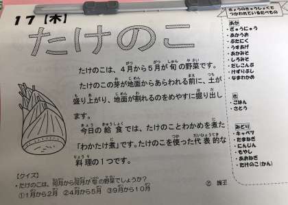 今日は、わかたけ煮に「たけのこ」が入っていました。