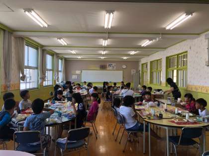 今日は、3年生と4年生がランチルームで交流給食をしました。