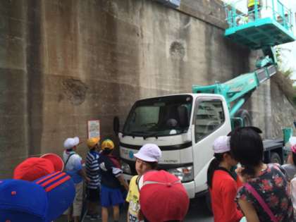 そのあと、城北小学校近くの機銃掃射跡を見に行きました。