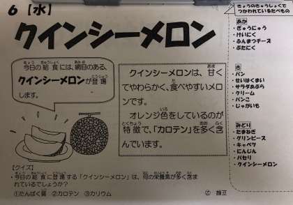 今日の給食に登場した「クインシーメロン」は、まろやかな甘みと滑らかな舌触りが楽しめました。美しいオレンジ色の果肉が特徴で、βカロテンを多く含まれています。日持ちもよく最近人気があるメロンです。
