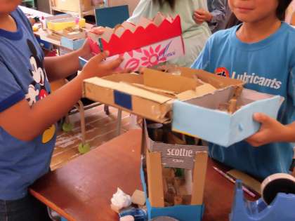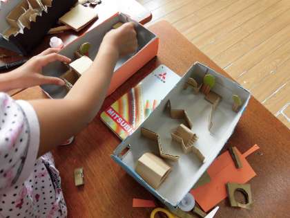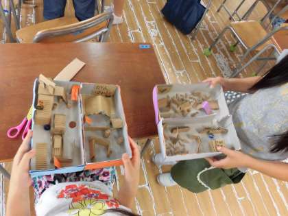 完成した子はお互い完成した子同士、作品で遊んで工夫しているところを見つけたり、難しい迷路に何回も挑戦したり、友だちの作品のすごいところ、工夫できているところを見つけることができました。
