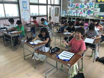 道具の置き方や書くときの姿勢など、しっかり学んで、いよいよ書きます。