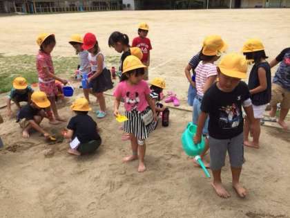 せいかつの時間に砂遊びをしました。いつもはシートをかけている砂場をオープン!水をかけておだんごを作ったり、山をつくったり、穴をほったり、子どもたちは砂場遊びの名人です。来週は水遊びです!