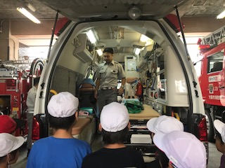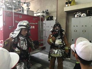 救急車の中に入れていただいたり、防火服やヘルメットを身につけさせていただいたり、消火活動や救助活動の訓練の様子を見せていただいたり、実りの多い見学になりました。