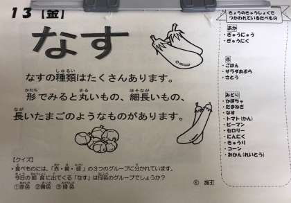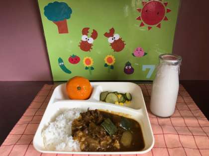 今日の給食は、子どもたちに人気の夏野菜のカレーライスでした。夏野菜の「かぼちゃ、なす、ピーマン」がカレーの中に入っていました。