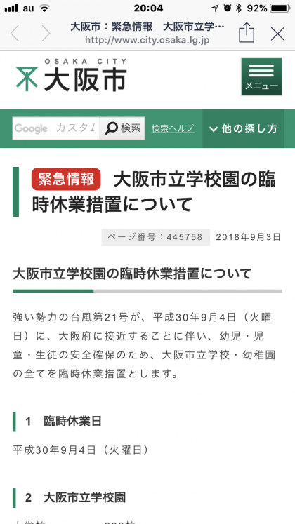 先程、大阪市より小学校など全校臨時休業の発表がありました。したがって明日はお休みです。