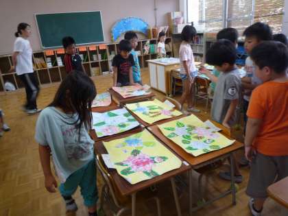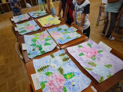 低学年室を「あじさいミュージアム」に変身させ、みんなの作品をずらりと並べました。