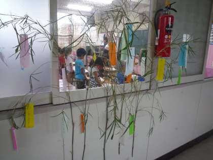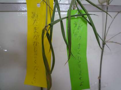 学校に笹があったので、管理作業員さんに切っていただき、その短冊を飾っています。