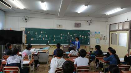 自分が調べてきた洗濯表示を黒板に書き、そのマークの意味を調べてきた子どもたちがマークについての解説をしてくれました。