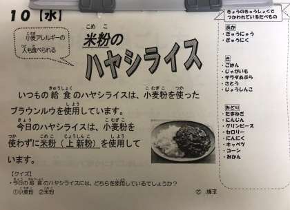 今回のハヤシライスは、小麦粉で作ったブラウンルウを使用せず、米粉を使用しています。そのため、小麦アレルギーのある児童生徒に配慮した献立となっていて、あっさりとした味わいになっています。