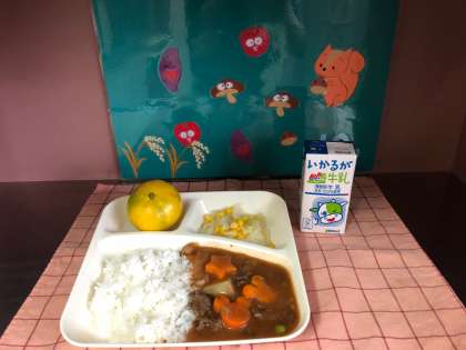 そして、ハヤシライスに入っている「にんじん」を「ラッキーにんじん」に給食調理員さんがしてくれました。児童は、入っているかな?と楽しみにしていました。