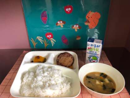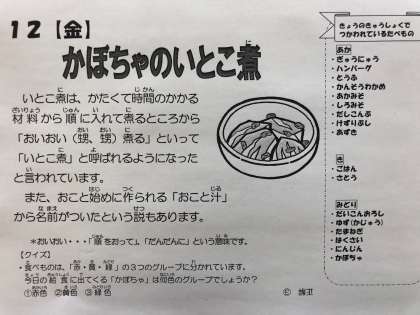 今日は、かぼちゃにあずきが入った、いとこ煮が給食に登場しました。