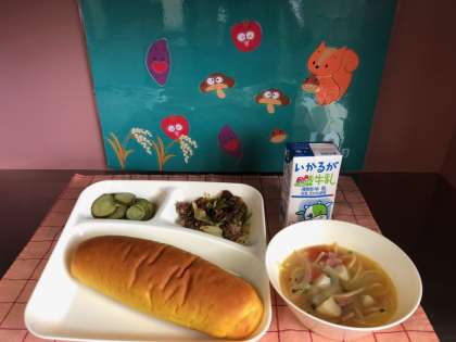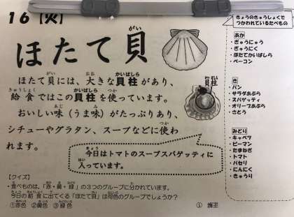 今日の給食では、トマトのスープスパゲッティに「ほたて貝」が入っていました。