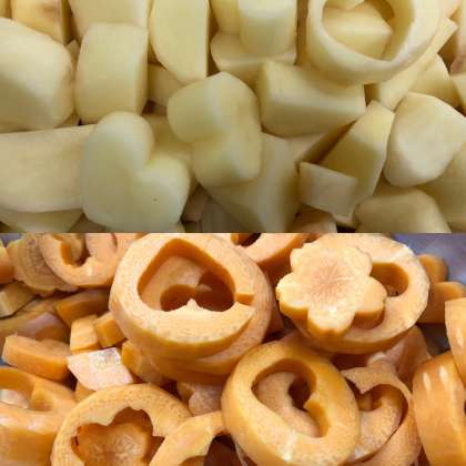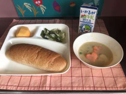 今日は、コーンクリームシチューの中に「じゃがいも、にんじん」が「ハート型、花型」の「ラッキーにんじん、ラッキーじゃがいも」を給食調理員さんが作ってくれました。