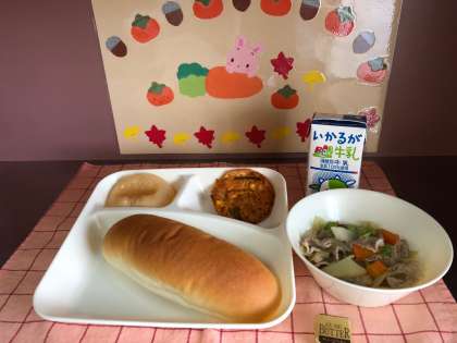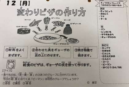 「変わりピザ」は、手作り献立で、「ツナ、コーン、ピーマン、ピザソース、チーズ」を混ぜあわせ、餃子の皮の上に給食調理員さんが、1つずつのせ、焼いています。