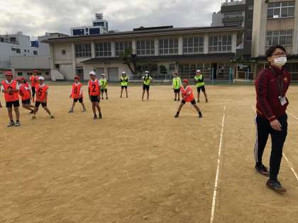 生江小学校、城北小学校、大宮西小学校の5年生でスポーツ交流会をしました。生江小学校の5年生は、人数が少ないので、とても緊張している様子でした。8つのチームに分かれて、ドッジビーやミニ綱引きをしました。「他の小学校の子に勇気出して声かけてん。」「いっぱい話したで。」と満足気に話をしてくれる子もいました。再来年、中学校でまた会えるのを楽しみにしている子も多くいました。