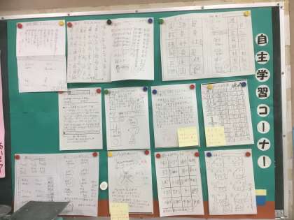 背面黒板の自主学習コーナーには、みんなの取り組んだ自主学習を紹介しています。