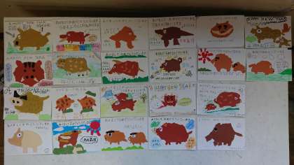 また、お正月におうちに届く年賀状もちぎり絵で作成しました。子どもたちの個性あふれる楽しい作品が出来上がりましたので、おうちに届くのを楽しみにしてください☆