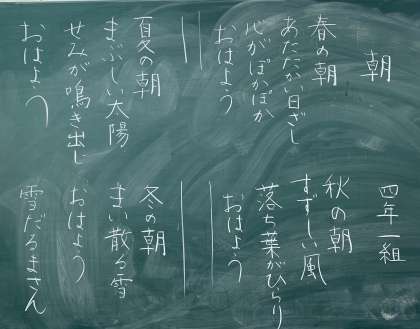 写真にあるのは、題と第一連を指導者が考え、第2連以降を4年1組のみんなで考えていきました。なかなか素敵な詩が完成しました。