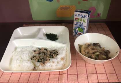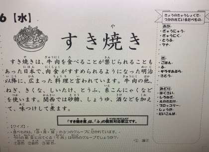 今日の給食献立の「すき焼き煮」は、「牛肉、ふ、糸こんにゃく、とうふ、はくさい、えのきたけ」に砂糖、みりん、塩、こい口しょうゆで味つけしました。