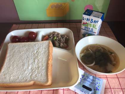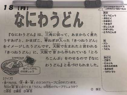 大阪市の給食では、「きつねうどん」をイメージして、三角に切って甘辛く煮たうすあげと、かまぼこ、青ねぎを入れ、とろろこんぶを添えたうどんを、「なにわうどん」と名付けています。