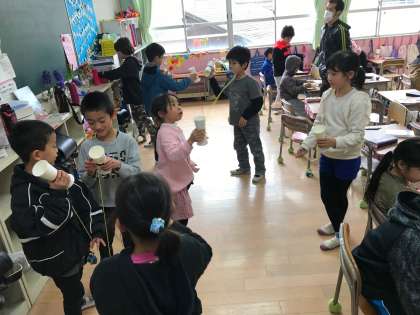 2年生が1年生に紙コップけんだまのおもちゃの作り方を教えました。