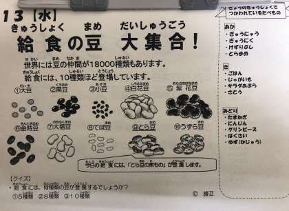 また、大阪市の給食には、10種類の豆が使われています。今日の献立には、「とら豆」が登場しました。