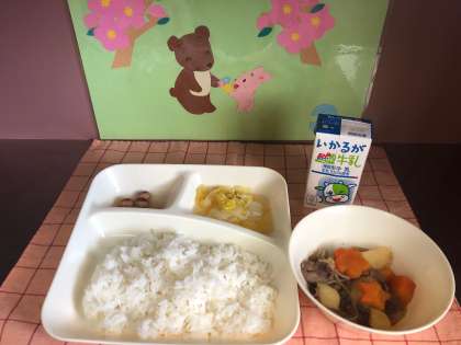 今日の給食献立の「肉じゃが」に入っている「にんじん」を「花型・星型・ハート型」にしてラッキーにんじんを給食調理員さんが作ってくれました。