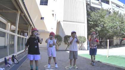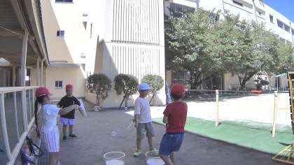 今日はみんなでしゃぼんだまをしました。ストローで自分たちでつくった吹き具や、うちわを使いました。もこもこ泡が重なったしゃぼんだまや、大きなしゃぼんだまができて、みんな大興奮。楽しい時間をすごしました。最後はみんなで協力して片付けも完ぺきな1年生でした。