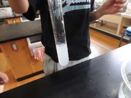二酸化炭素?酸素?どちらなのか、水上置換法を用いて、あわを集めて、石灰水を入れたり、火のついた線香を入れたりして、正体を暴いていました。