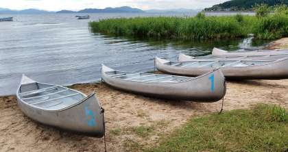 今からカヌーでびわ湖に漕ぎ出します。漕げよ生江小。