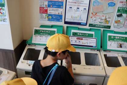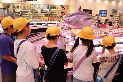 3年生は、社会見学でスーパーに行きました。入り口に旬の果物を並べているのは、季節を伝えるための工夫だと教えてもらいました。また、お客さんの希望に合わせて、野菜やお肉を切っていることも知りました。お店の裏側では、大きな冷凍庫や、食品を加工する場所なども見せてもらいました。ふだんは見えないところでも、いろいろな工夫があることがわかりました。スーパーの皆さん、見学させてくださってありがとうございました。