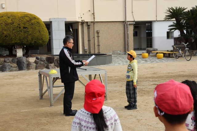 寒くなってきましたが、朝から運動場で児童朝会がありました。寒さに強い身体を作るために早寝・早起き・朝ごはん!そして、学校へ来て外遊びをいっぱいしましょう。
