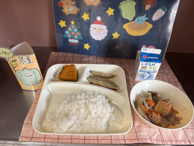 ごはん、牛乳、きびなごのてんぷら(タレにゆずを使用)、豚肉とあつあげの煮もの、焼きかぼちゃの甘みつがけ