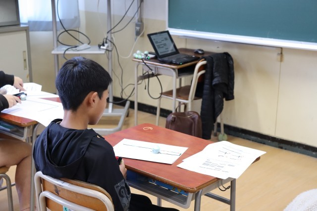 6年生は3時間目、プログラミング体験学習を行いました。大阪工業大学の先生に教わり、ロボットに命令して迷路を抜けるアルゴリズムを考えました。色付きのマジックでプログラミングを行い、オゾボットを動かしました。一人ひとりが自分で作ったルートでゴールまでたどり着けるか。